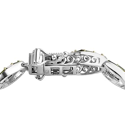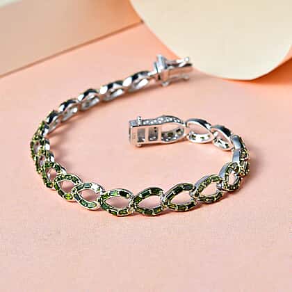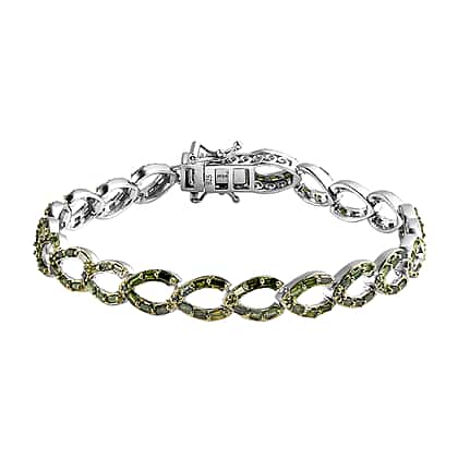 Make your outfit sparkle and shine more with this stunning green diamond bracelet. It is made from 925 sterling silver with a platinum overlay to give it a bright shine and lustre. The teardrop links feature diamonds in vivid shapes and sizes decorated on the frame giving it a dazzling look. It has a smooth under gallery and an open box clasp to secure the fit on your wrist and grace the look of your outfit.