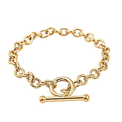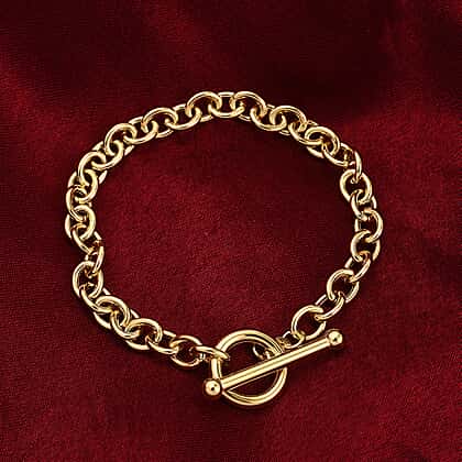 Your wrist will be enriched with shine and glory with this gold bracelet. The bold design of thick circular interconnected links gives this gold necklace a statement look that is hard to pass by the onlookers. The stylish and easy T (Toggle) bar clasp encloses this charming, personality-uplifting piece of jewellery. Crafted by expert goldsmiths, this designer-inspired bracelet is crafted in 9K yellow gold and manages to add glory to your attire.