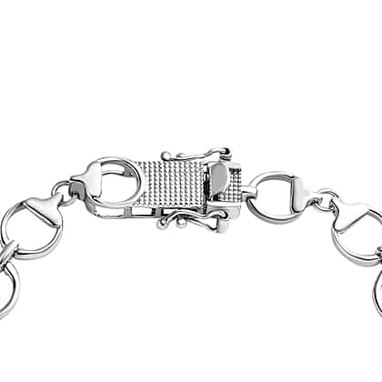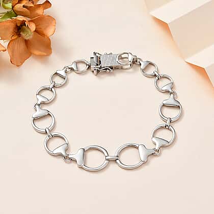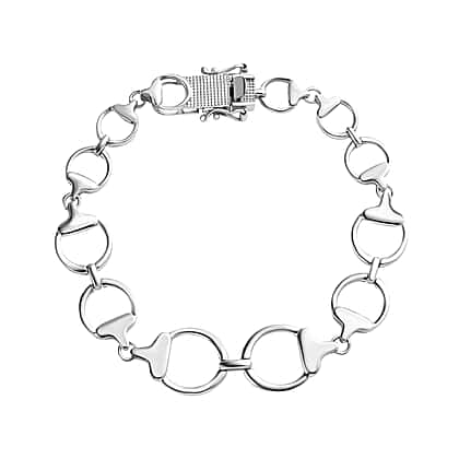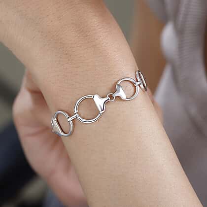 This designer inspired Platinum Overlay Sterling Silver Snaffle Bracelet is where equestrian meets elegance. At 7.5 inches, this bracelet reflects a love for craftsmanship and detail, with each snaffle a nod to the timeless art of horse riding, refined and reinterpreted for the modern jewellery connoisseur. This also corresponds to the creature couture for those who love to carry a bit of wild on their skin.