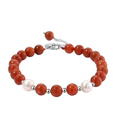 D'Joy Enhanced Red Jade & White Fresh Water Pearl Beads Bracelet (Size 7 - 2 Ext) in Rhodium Overlay Sterling Silver 80.00 Ct.