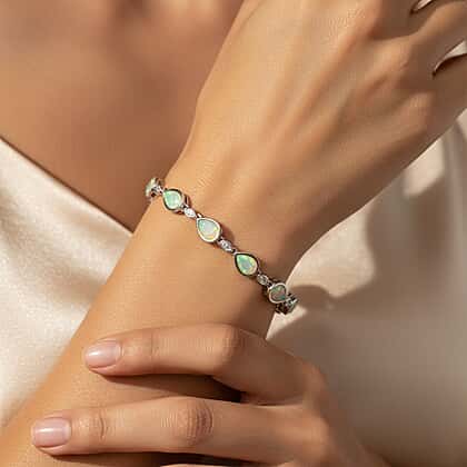 Displaying kaleidoscopic colours of nature, this Ethiopian opal link bracelet is a perfect choice for anyone who loves elegance and sophistication. Each opal is valued for its rare, natural play-of-colour, offering soft flashes that feel unique to every movement. The moissanites bring fire and brilliance, closely mirroring the charm of natural diamonds. Secured by a box clasp and set in hypoallergenic, tarnish-resistant sterling silver with rhodium overlay, this bracelet is a perfect choice for any skin type. Pair this 7.5-inch beauty with matching earrings for effortless styling.