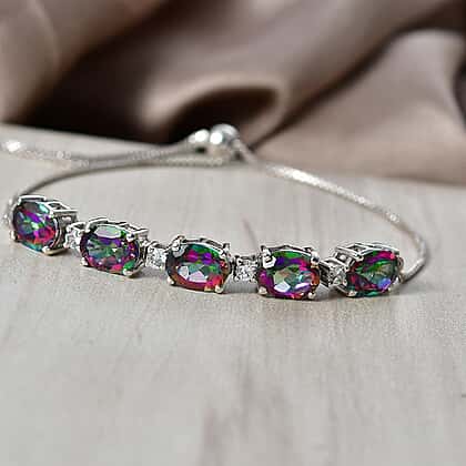 With lively colour and soft shimmer, this mystic topaz and white zircon adjustable bracelet brings an uplifting twist to your everyday look. Mystic topaz is prized for its shifting rainbow tones, vibrant fire, and strong resistance to daily wear, making it a favourite for confident, expressive styling. White zircon adds clear brightness, scattering light gently along the wrist. Set in rhodium‑overlay sterling silver that’s hypoallergenic, tarnish‑resistant, and suitable for sensitive skin, it won’t turn skin green. The adjustable slider ensures an easy fit up to size 10.5 inch, offering comfortable wear and that subtle spark of self‑expression throughout your day.