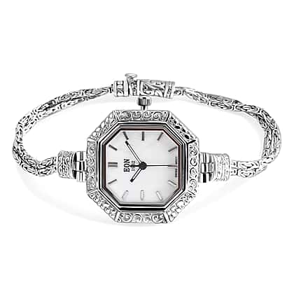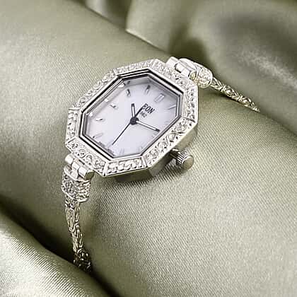 D'Joy Sterling Silver Octagonal Dial Watch Byzantine Chain Bracelet (Size 6.5)