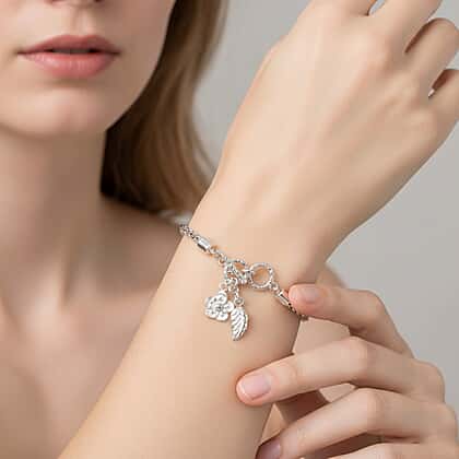 For a more unexpected look, consider this D'Joy sterling silver T-bar bracelet. It features a stunning fusion of classic and modern design sensibilities. This bracelet comes with a T-bar closure, which comes attached to a delicate floral and leaf detail. These sculpted details add a feminine allure to the design. Crafted in sterling silver, a textured chain that can help add a bit of personality to your look. This bracelet can be worn alone and also looks great when stacked with other silver pieces.