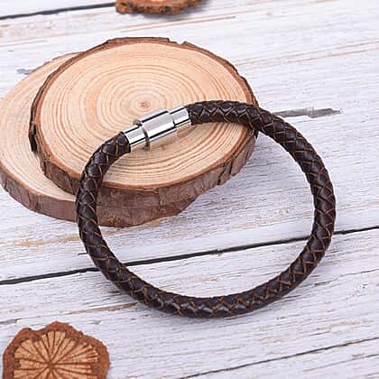Genuine Braided Leather Bracelet (Size 7) in Stainless Steel - Brown