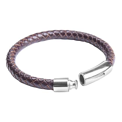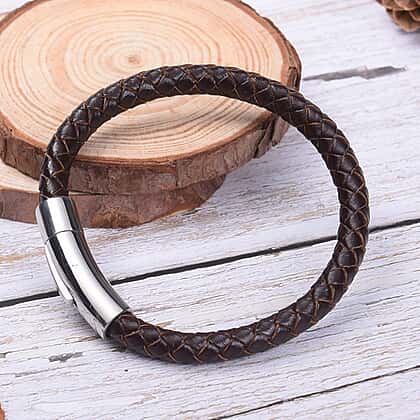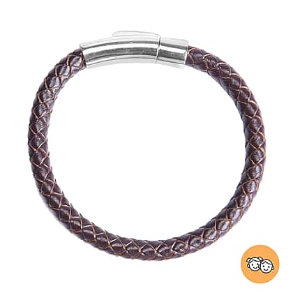 Genuine Braided Leather Bracelet (Size 7) in Stainless Steel - Brown