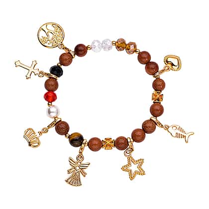 Gift your spiritual inner being this fabulous gold sandstone bracelet, as this beauty is designed just for you. Laced with white shell pearls, yellow tiger eye and simulated multi gemstone charm beads, this bracelet is a beautiful artwork designed to represent the love and values that Jesus Christ has spread throughout life. Each element on this bracelet represents life's journey to death and significant events, including the disciples of Christ, crucifixion and shedding of precious blood for humankind, love and service for the people, and the holy spirit. Take home this work of art fashion jewel.