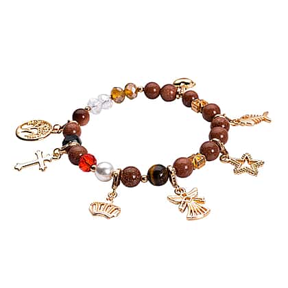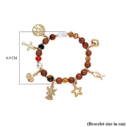 Gold Sandstone, White Shell Pearl , Yellow Tiger Eye and Simulated Multi Gemstone Charm Beads Bracelet (Size - 7.5 - 8.00) Strechable in Gold Tone