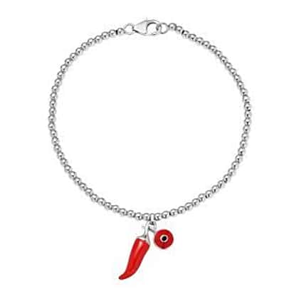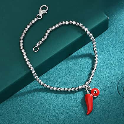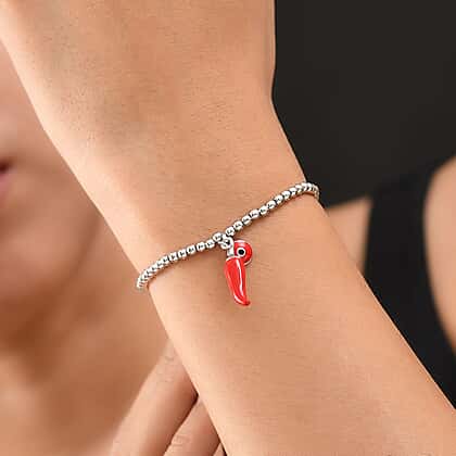 Add a playful touch to your jewellery box with this enamelled red chilli charm bracelet by the GP Chilli Pepper Collection. Symbolising protection and good fortune, the vibrant chilli pepper charm stands out against a strand of polished sterling silver beads, finished with a secure lobster clasp for easy wear. Crafted in rhodium overlay sterling silver, it’s hypoallergenic, tarnish-resistant and suitable for sensitive skin, ensuring long-lasting shine. The bold red enamel brings an instant pop of colour, while the fun design makes it perfect for layering or wearing solo. A quirky, meaningful bracelet you’ll reach for every day.