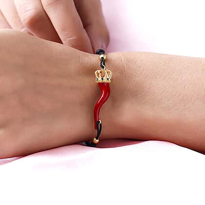 The cord bracelet is crafted by looping the strings together and connecting the charm in the centre. The charm design is inspired by Pippo Perez and crafted in a chilly pepper shape having two ball cut silver on both ends. Chilli pepper is symbolic of regeneration & fertility and comes in the most favourite & revered designs of GP. The bracelet's charm looks like a real chilly with its unique built & intricate detailing of Crown design on the top. The crown's bottom is studded with round faceted Blue Sapphire Enamel in prong setting. The bracelet is fashioned out in high quality vermile yellow gold plated sterling silver for bright and glossy lustre. It comes with high standard polish for mirror bright finish.