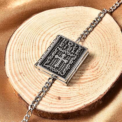 If your partner is a woman of faith, then this Holy Bible bracelet in Size 7 is the perfect gift for her. A miniature model of the Holy Bible holds the stainless steel bracelet together. You can open and close the Bible motif. The cover of the Bible has a holy cross on it. The pages engraved with lines from the Bible can be flipped for viewing.