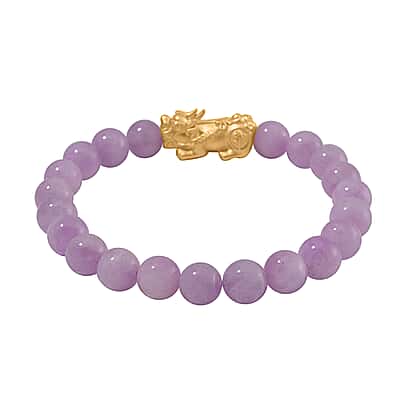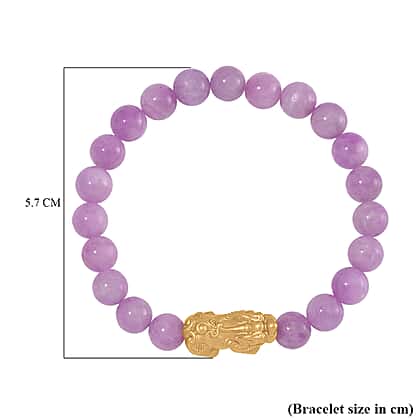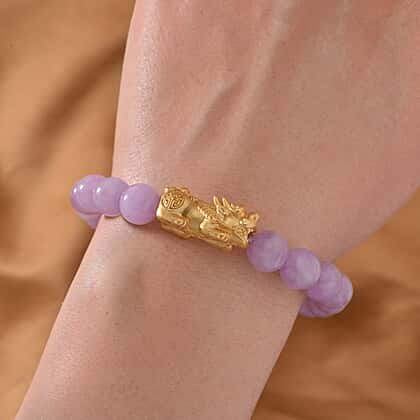 Wear this Kunzite Pixiu Bracelet, a fabulous token of gratitude and blessings, to seize the day. The bracelet with a Size 7 is made with Kunzite beads on a stretchable and sturdy string. Pixiu motif is believed to usher in good luck and vibes. Yellow Gold Overlay leaves the Sterling Silver ornament with a head-turning finish.