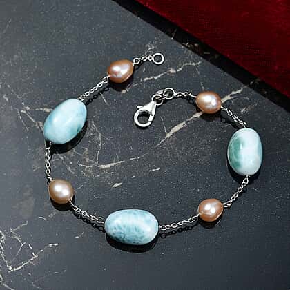Larimar & Fresh Water Pearl Bracelet (Size - 7.5) with Lobster Clasp in Rhodium Overlay Sterling Silver 50.00 Ct.