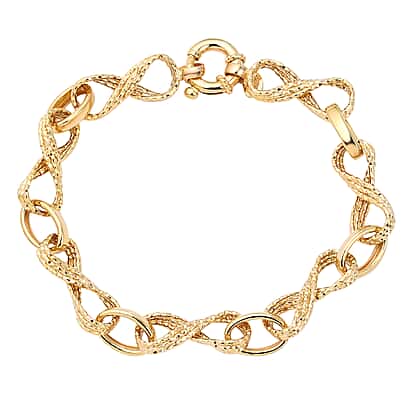 The link bracelet is made up of 9K Yellow Gold. The bracelet has loop and infinity links that are interlocked together for a beautiful piece of jewellery. The infinity link has a diamond cut design on it. The diamond-cut design allows light to reflect at every angle. The infinity designs are interlocked with a loop link. The bracelet is secured by a spring clasp.