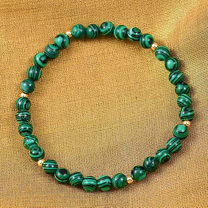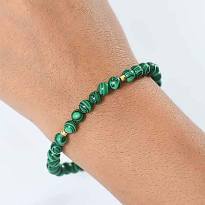 This malachite bracelet brings a vibrant pop of colour to any outfit with its rich green hues and natural banding, symbolising protection and transformation. Crafted with smooth, round malachite beads, it features a stretchable design for a secure and comfortable fit. This bracelet is made in 18K yellow gold plating over 925 sterling silver and offers durability and enduring shine. The hypoallergenic properties of the metals provide comfort and security for sensitive skin. The gemstone adds a touch of luxury, making it perfect for casual wear. A beautiful, meaningful piece for gifting to your close ones.