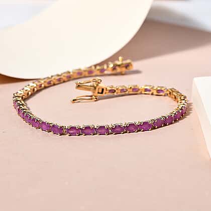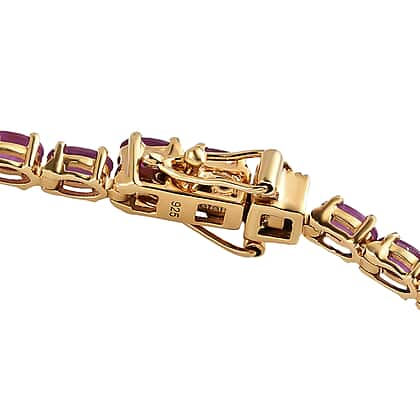 This lovely bracelet from the TJC collection is made of 925 sterling silver and lavishly plated in 14K yellow gold. A captivating appearance is provided by 34 bright pink Moroccan Ruby gemstones. Furthermore, this women's bracelet is fastened with an open box clasp for easy access.