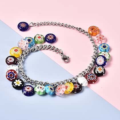 Multi Colour Murano Style Glass Multi Charm Beaded Bracelet 7.5 with 1.5 Inch Extender