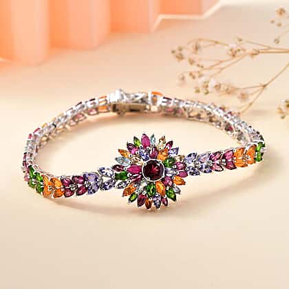 Wear the beauty of a garden in full bloom on your wrist with this gorgeous Multi Gemstones Cluster Bracelet (Size - 7). Cast in Rhodium Overlay Sterling Silver, the bracelet features 109 stunning gemstones, spreading out in a floral arrangement around a 6 mm Rhodolite Garnet at the centre and further on the bracelet. The bracelet is also studded with Natural Chrome Diopside, Paraiba Apatite, Fissure Filled Ruby, Fire Opal, Tanzanite and Citrine.