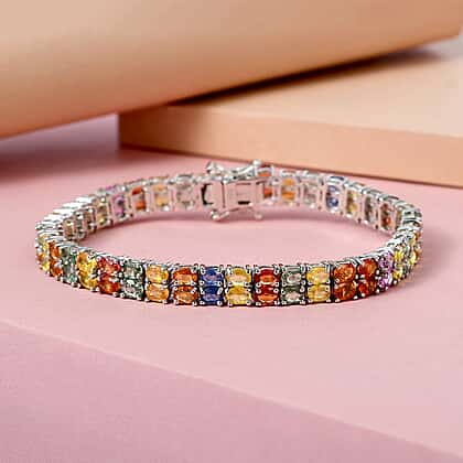 Enhance the look of your outfit with this sparkling double-row, multi-sapphire tennis bracelet. Inspired by the rainbow theme, the bracelet features vivid colour oval-shaped sapphire gemstones prong set in the frame exhibiting bright shine and sparkle. It is crafted from 925 sterling silver with a platinum overlay and secured with an open box clasp to give you a comfortable fit. Pair it with TJC's exclusive sapphire jewels to complete the look.