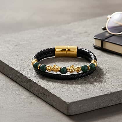 Natural Jadeite Jade Beads & Pixiu Charms Bracelet (Size 8) in Yellow Gold Plated 50.00 Ct.
