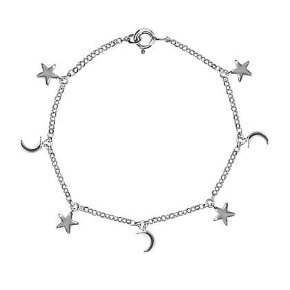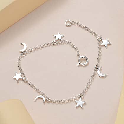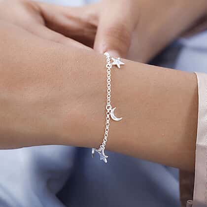 Want to embed the beauty of stars and moon on your wrist in the most elegant way? Look no further than this sterling silver bracelet with he celestial charms of stars and moon. This minimal looking beautiful bracelet can go well with all kinds of outfits. It can be worn for everyday wear. The bracelet comes with a spring lock.