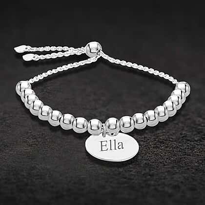 Personalised Engravable Rhodium Plated 17mm Disc Beaded Adjustable Slider Bracelet in Silver, Size-9 Inch