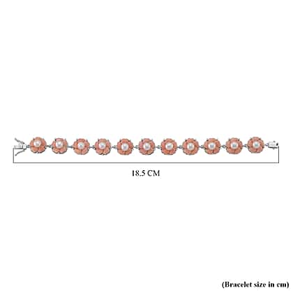 Adorn your wrist with seaside beauty with this floral-inspired bracelet, featuring a queen conch shell in a blooming flower petal design. The queen conch shell is complemented by the white freshwater pearl, lying at the centre of each flower design, creating a striking piece. Crafted in rhodium overlay over 925 sterling silver, this bracelet ensures durability and enduring shine. The hypoallergenic nature of the metal makes the piece safe and secure for sensitive skin. Finished with a box clasp closure for security and comfort fit throughout the day. The linking design with the contrast hue of queen conch shell and white freshwater pearl captures attention, making it suitable for special gifting and personal styling.