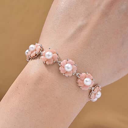 Adorn your wrist with seaside beauty with this floral-inspired bracelet, featuring a queen conch shell in a blooming flower petal design. The queen conch shell is complemented by the white freshwater pearl, lying at the centre of each flower design, creating a striking piece. Crafted in rhodium overlay over 925 sterling silver, this bracelet ensures durability and enduring shine. The hypoallergenic nature of the metal makes the piece safe and secure for sensitive skin. Finished with a box clasp closure for security and comfort fit throughout the day. The linking design with the contrast hue of queen conch shell and white freshwater pearl captures attention, making it suitable for special gifting and personal styling.