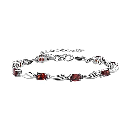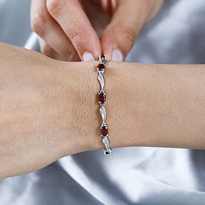 The Red Garnet Bracelet is made from Platinum Overlay Sterling Silver. It envelops your wrist in the warmth of a glowing hearth. Each of the eight garnets, deep as a fine Bordeaux and faceted to perfection, sparkles with an inner fire, reminiscent of embers on a winter's night. This tennis-style bracelet, crafted in sterling silver with a luxurious platinum overlay, is elegance defined. Its adjustable length ensures a perfect fit, making it a personal talisman.