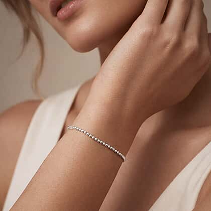 Minimalistic in style, this bracelet feels extra dainty owing to the alluring beads at the centre. This sterling silver beaded slider bracelet comes with an adjustable bead closure. It allows you to easily tighten or loose the bracelet as per your comfort and aesthetic. Crafted in rhodium overlay sterling silver, the beaded details come attached to a dainty chain, which further heightens its demure and elegant feel. The beads also help add texture and create a delicate centre, which helps the bracelet punch above its waist.