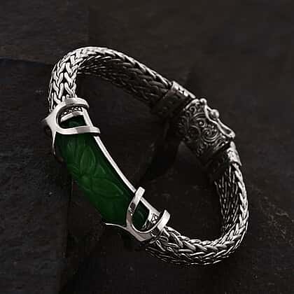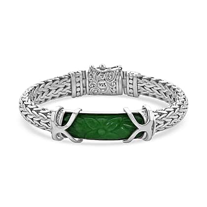 Royal Bali Collection - Carved Green Jade Bracelet (Size - 7.5) in Sterling Silver 23.70 Ct, Silver Wt 63.00 GM