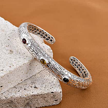 - Bezel-set tourmalines accent the look of the serpentine bracelet.