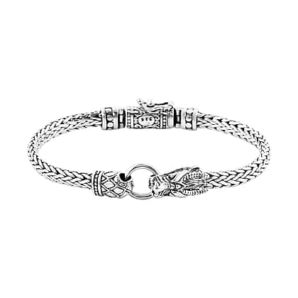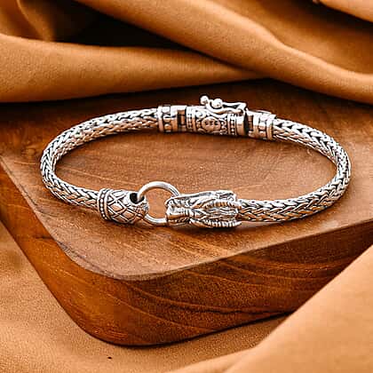 Step into the world of mythical elegance with this dragon head bracelet from the Royal Bali Collection, where Balinese artistry springs to life. This 7.5-inch bracelet, with its intricate braided design and fierce dragon head feature, wraps your wrist in mystique and style. The durable box clasp ensures a secure fit, allowing you to carry a piece of Bali's enchanting tradition wherever you go. This bracelet is made of sterling silver and will surely make you shine for the right reasons.