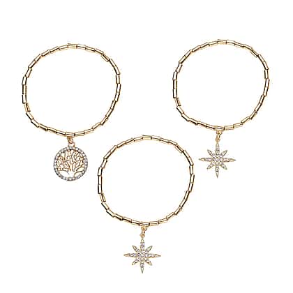 Adorned with dainty charms that allow these to be layered with cuff bracelets, watches, or stacked between your favourite bangles, this set of 3 white Austrian crystal charm bracelets makes a standout addition to your collection. Each of the Size-7.5 stretchable bracelets is studded with a charm – a star, a tree of life, and a flower – that adds a dainty effect.