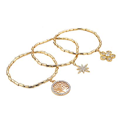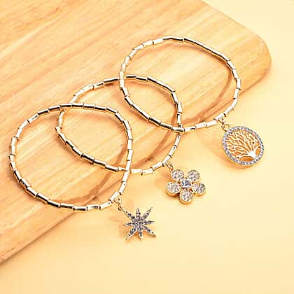 Set of 3 - White Austrian Crystal Flower, Star & Tree of Life Charm Stretchable Bracelet