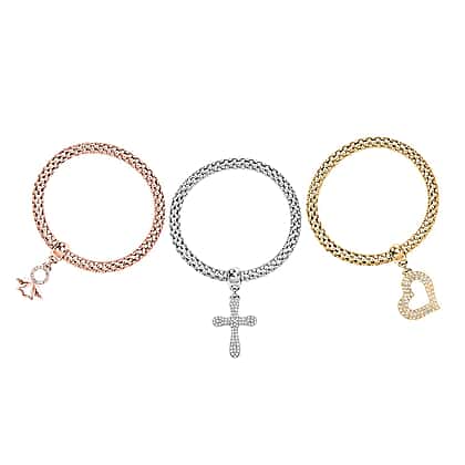Set of 3 - White Austrian Crystal Pave Bracelets (Size 7.5 Stretchable) With Charms in Three-Tone