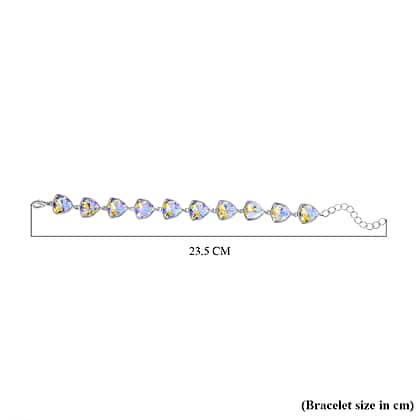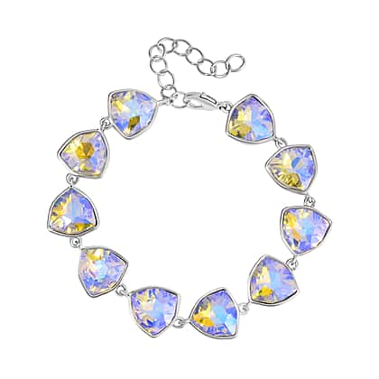 Radiating a magical aura on your wrist, this Simulated Mystic White Austrian Crystal Triangle Bracelet is sure to turn heads. The bracelet features 11 bezel-set Mystic White Austrian Crystals that exude a gorgeous glow, matched only by the moon. The crystals exhibit excellent clarity and brilliance, making the Size 7.5 bracelet an eye-catching piece of jewellery.