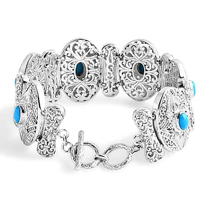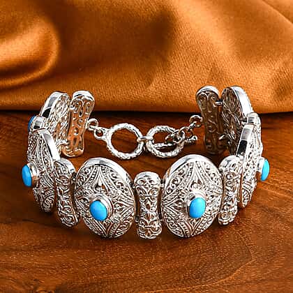 A modern take on vintage artistry, this sterling silver bracelet captures the allure of heritage craftsmanship. It features intricately carved panels adorned with gorgeous oval-cut Sleeping Beauty turquoise. These stones are celebrated for its vivid sky-blue hue and flawless clarity. The ornate silverwork frames each stone like a treasure from another era, evoking the romance of faraway lands. The intricately carved filigree patterns with geometric precision makes this piece feel like a work of art. This embellished bracelet comes with a classic T-bar clasp, which adds a contemporary touch to the design. Whether paired with a silk blouse or a casual linen dress, it lends an artistic, quiet opulence to every ensemble.