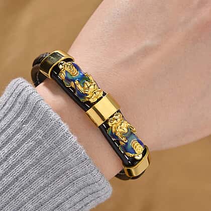 Super Find - Genuine Leather with Alloy-Std Yellow Pixiu Enameled Bracelet (Size - 8)