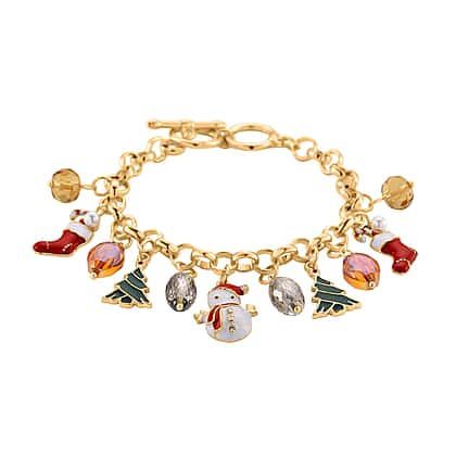 Add some festive cheer to your jewellery collection with this charming bracelet. Designed with white austrian crystals, simulated pearls, and multi-colour crystals, it features playful charms like snowmen and christmas trees, bringing a fun, holiday spirit to your wrist. Meticulously crafted in yellow gold plating, this bracelet offers durability and warm-toned shine. The bracelet is finished with a T-bar clasp, offering both comfort and style. Perfect for adding a whimsical touch to any outfit during the festive season.