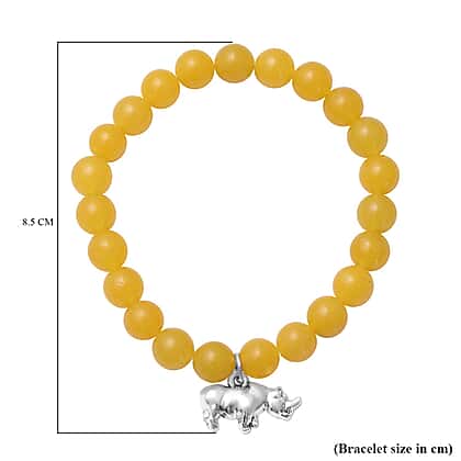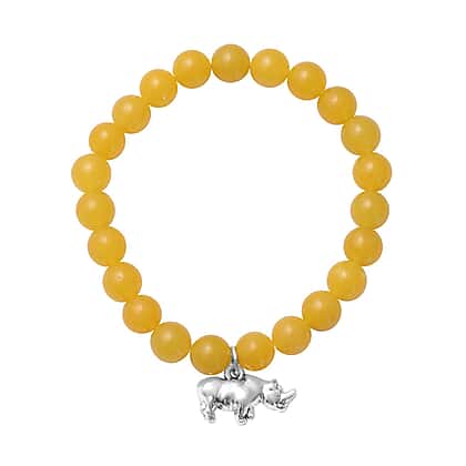 Yellow quartzite beads are used to decorate this bracelet. The Hippopotamus charm is located in the bracelet's centre. A stretch bracelet with yellow quartzite that has a pale yellow colour is in keeping with the current vogue for beaded jewellery. Use free beads that are evenly spaced out and braided into a robust and flexible string for a tight fit. The hippopotamus charm is made from an antique silver tone.