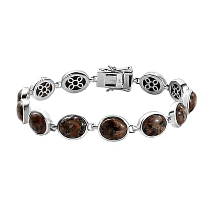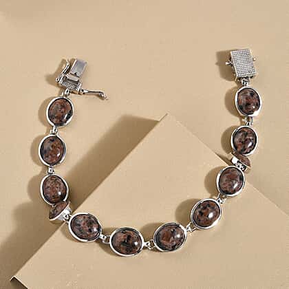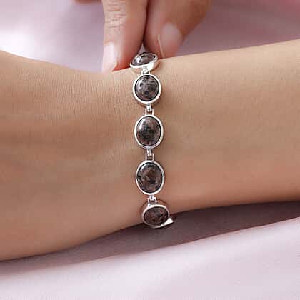 This yooperlite linking bracelet will be a great match to all your attires. The yooperlite is syenite-rich fluorescent sodalite that fluoresces an orange or yellow colour under ultraviolet light, providing you with a unique glow. The bracelet is made with an interconnection of oval links mounted with cabochon cut yooperlite. Crafted in platinum overlay sterling silver, this bracelet will add a unique charm to your jewellery collection.