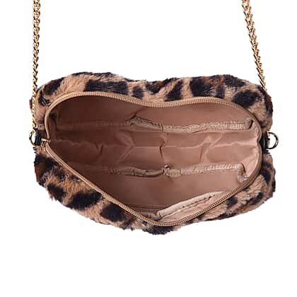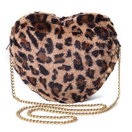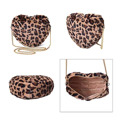 Brown Leopard Pattern Faux Fur Heart-Shaped Crossbody Bag with Chain Shoulder Strap in Gold Tone