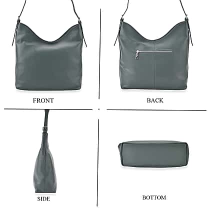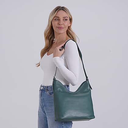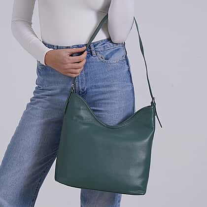 Effortlessly refined, this green genuine leather crossbody bag offers a perfect balance of elegance and everyday ease. Crafted from supple genuine leather with a smooth grain finish, it brings lasting quality and timeless appeal. The spacious interior features zipped and slip pockets for neatly storing your essentials, while the exterior zipped pocket adds extra convenience. Designed with a comfortable adjustable strap, it can be worn crossbody or over the shoulder. Subtle metallic zips and hardware complete its polished, versatile look — ideal for both casual outings and more refined moments.