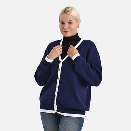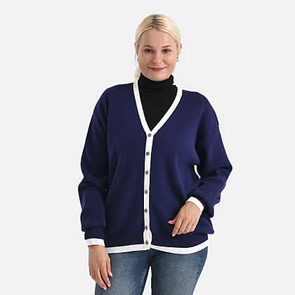 A classic V-neck button-down cardigan is a true must-have for any knitwear drawer. This Maisi is one such piece, made with high-quality viscose polyester and nylon which can help you keep warm as you enter the cosiest months of the year. This navy blue relaxed-fit, open-style cardigan with dropped shoulders features contrasting white linings which help to add a sense of interest to the outfit. It also features multiple buttons at the front and ribbed details at the hem which makes it a layering-friendly and stylish choice. Style this long sleeve cardigan with dresses or wide-legged jeans to complete your look.