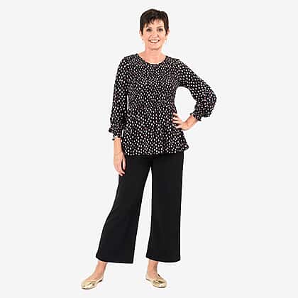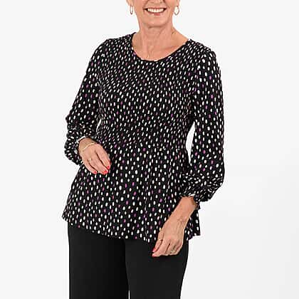 Go out in style with black Maisi Peplum Top that features a flattering peplum style that can help bring attention to your waist. Thus, it makes an ideal choice for individuals who want to create the illusion of an hourglass figure. Pair it with wide-legged jeans or trousers to strike a balanced look. It features full-length sleeves with cinched details at the end which helps to give it a structured look. The top features retro polka dot prints in white, lilac, and blush tones which helps to add a peppy playful touch to the design. It makes for a true wardrobe essential for those who adore fluid silhouettes.Pair it with wide-legged jeans or trousers to strike a balanced look.