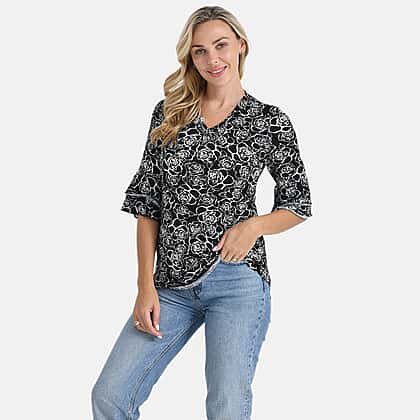 - Maisi Floral Print Frill Quarter Sleeve Top (Size M) - Black - White