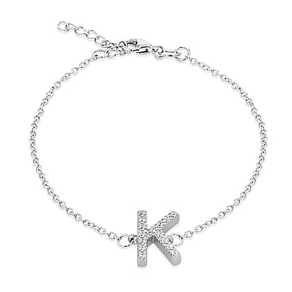 K Initial Bracelet 7.5 Inch in Sterling Silver Rhodium Plated Cubic Zirconia 7mm x 11mm