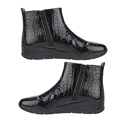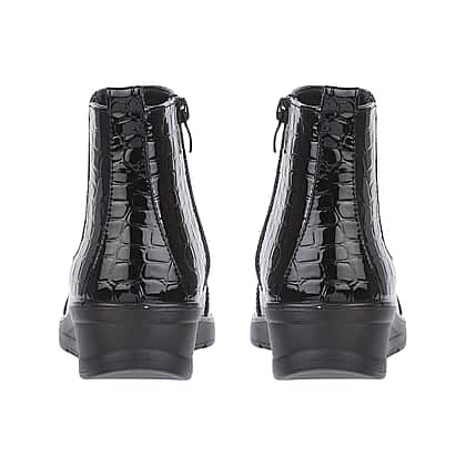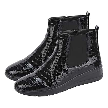 Step out in sleek, contemporary style with the Ladies BRAMBLE Croc Pattern Chelsea Boots. Featuring a glossy croc-embossed finish, these boots offer a sophisticated yet bold look. The elastic side panels and an inside zip fastening ensure effortless wear and removal, while the lightweight wedge sole provides enhanced comfort and support for all-day wear. With a warm lining, these boots are perfect for cooler weather, keeping your feet cosy whether indoors or outdoors. The classic Chelsea boot design paired with the modern croc pattern makes them a versatile addition to any wardrobe.
