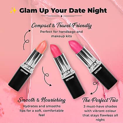 Discover the perfect date-night-makeup look with the Cetuem Lipstick Trio Bundle, a stunning collection curated by beauty experts to add a touch of glamour to any occasion. Whether you're out to win hearts, close a deal, or celebrate in style, these lipsticks will ensure you look your best. The bundle features three gorgeous shades that provide a glossing shine and long-wearing finish, keeping your lips smooth and vibrant throughout the night. Enjoy a flawless, glamorous look with this must-have trio.